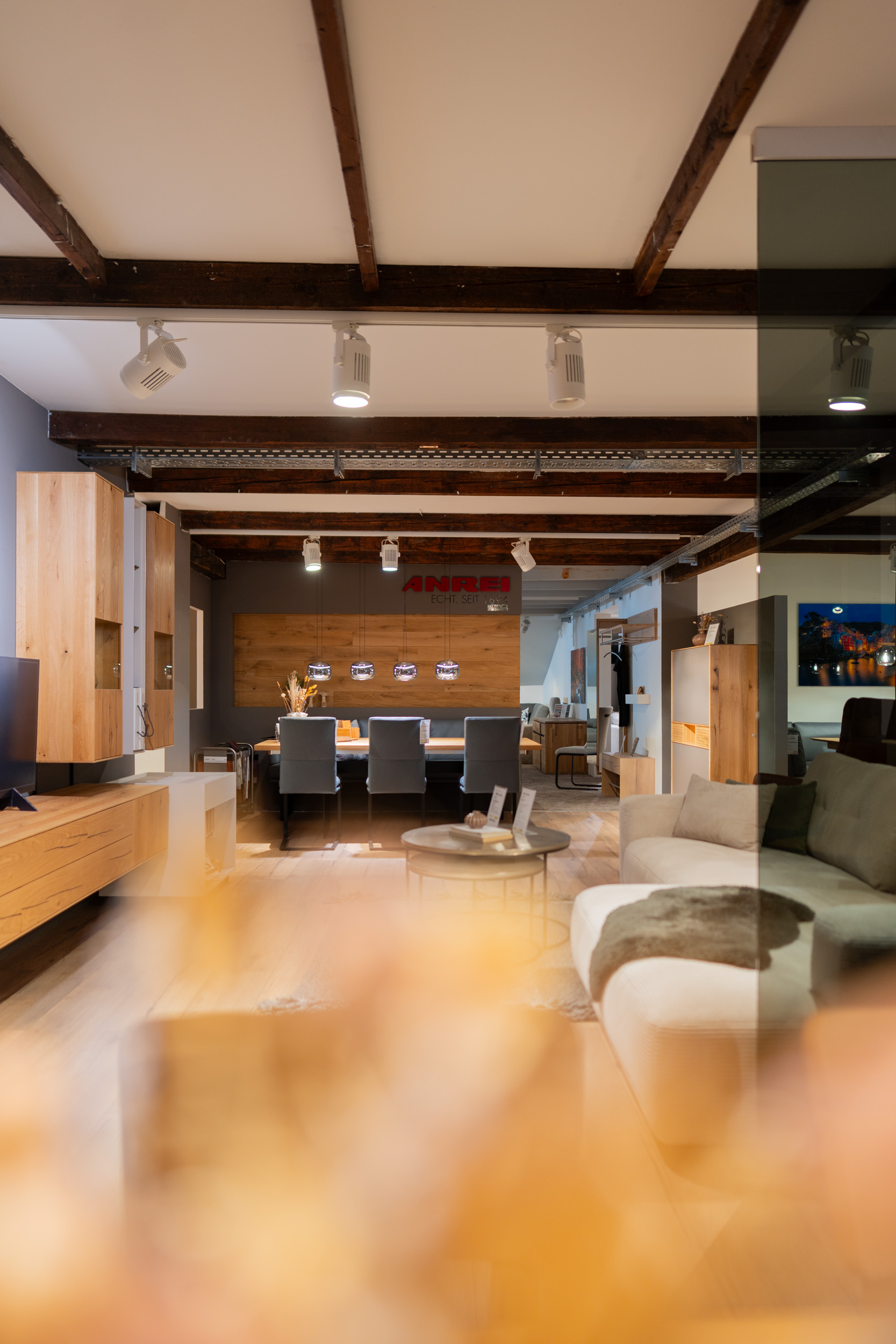 Das Möbelhaus ist über viele Jahre hinweg aus einem ehemaligen Stadel entstanden und wurde Schritt für Schritt erweitert. Dadurch ist eine einzigartige Struktur mit unterschiedlichsten Räumen, Bereichen und Blickachsen entstanden.